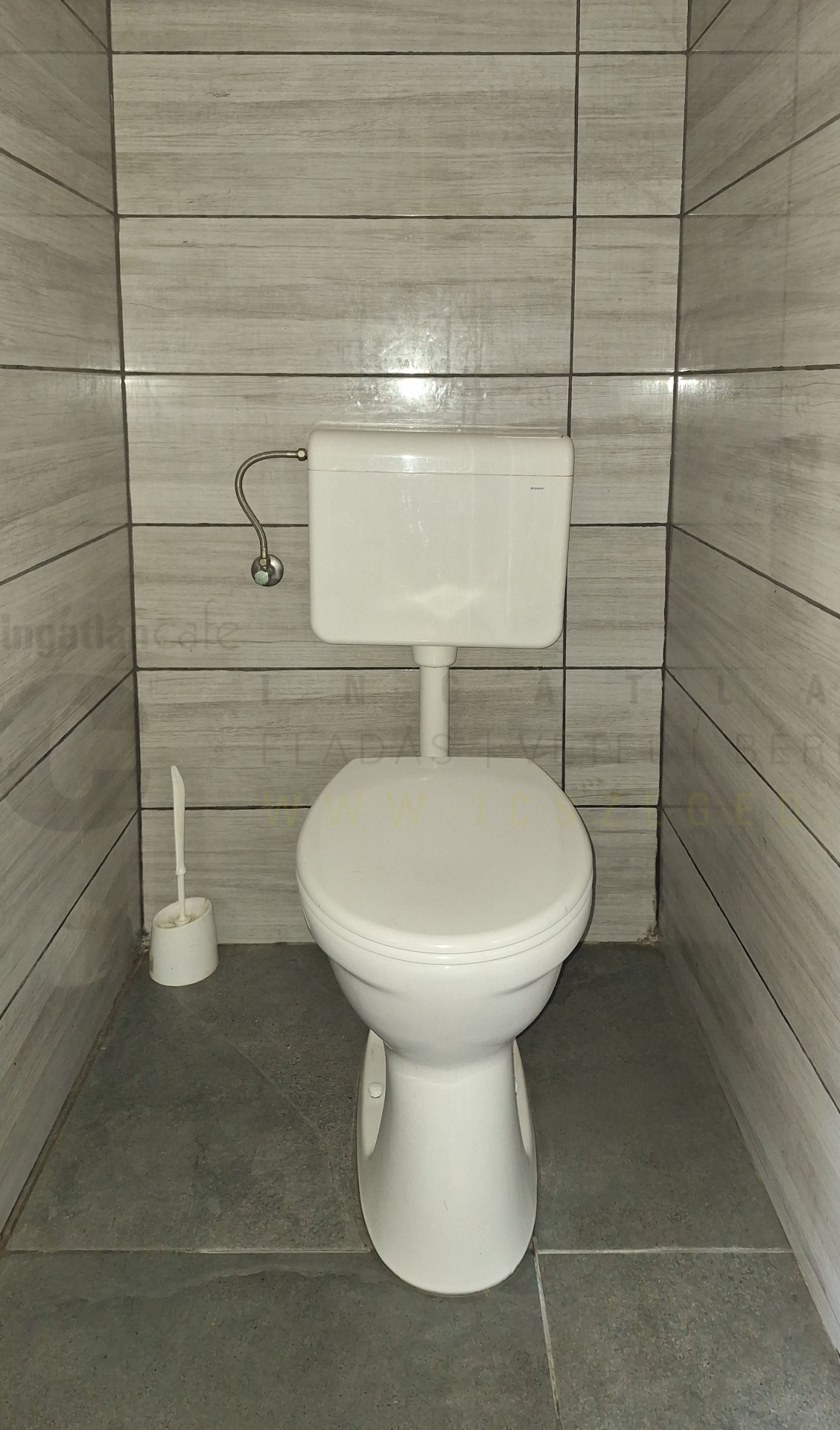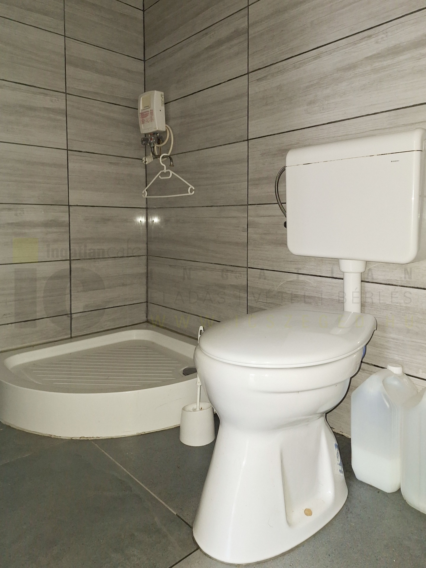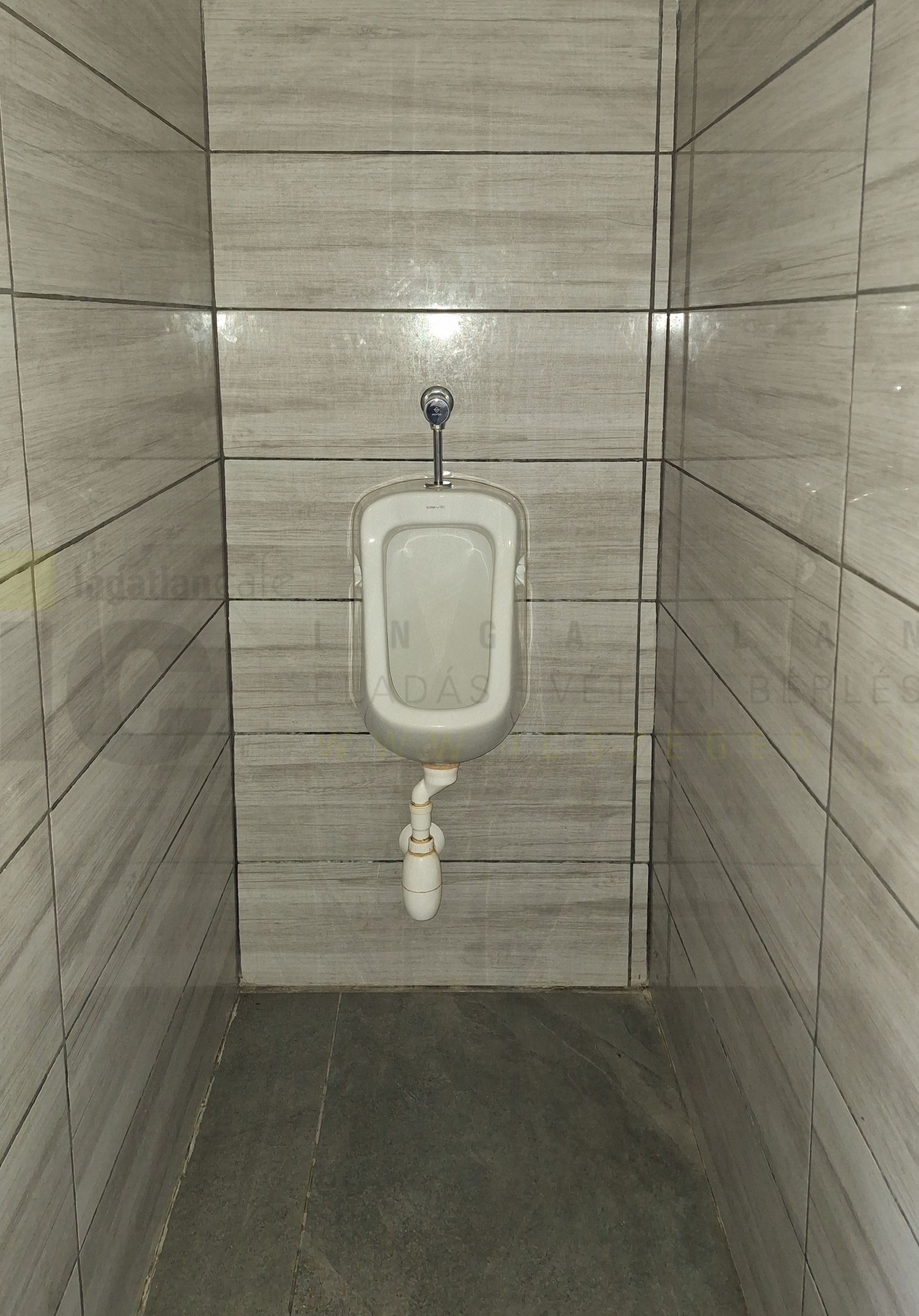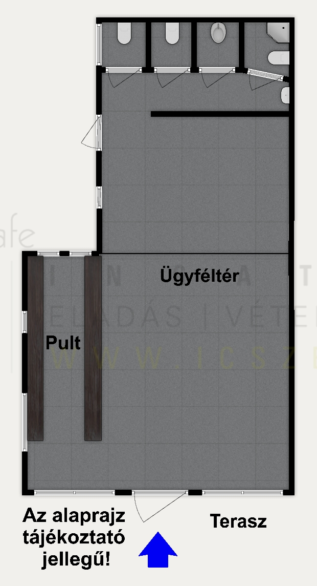 - elosztása: ügyféltér és kiszolgáló pult került kialakításra, a hozzáépített részen pedig tároló, illetve 4 db wc, ezek egyikében zuhanyzó, kívül pedig kézmosó kapott helyet