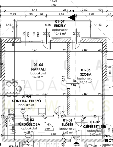 57,36 m2 lakás + (4,93/2 m2 erkély) = 59,825 m2 / 69 891 875,- Ft