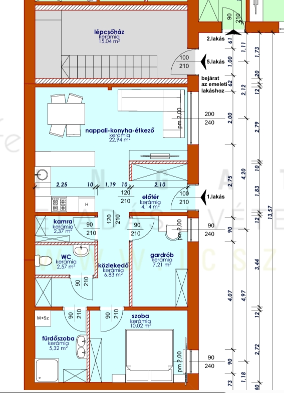 Elosztása: 1 db szoba, nappali-konyha-étkező, közlekedő, fürdő, wc, kamra, gardrób