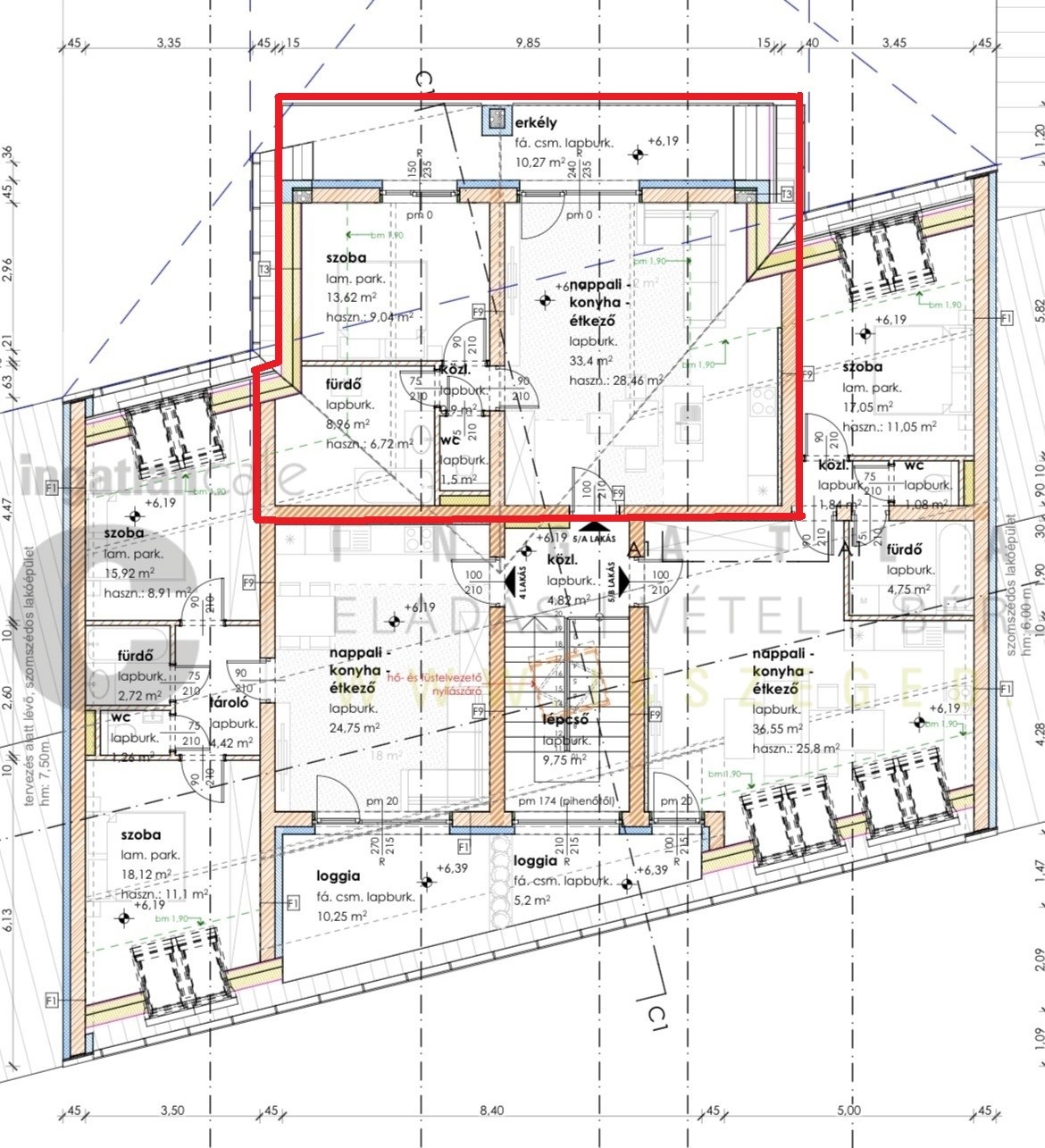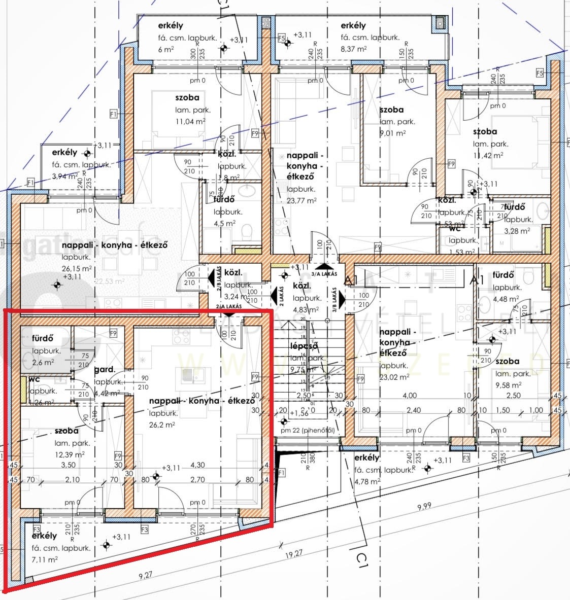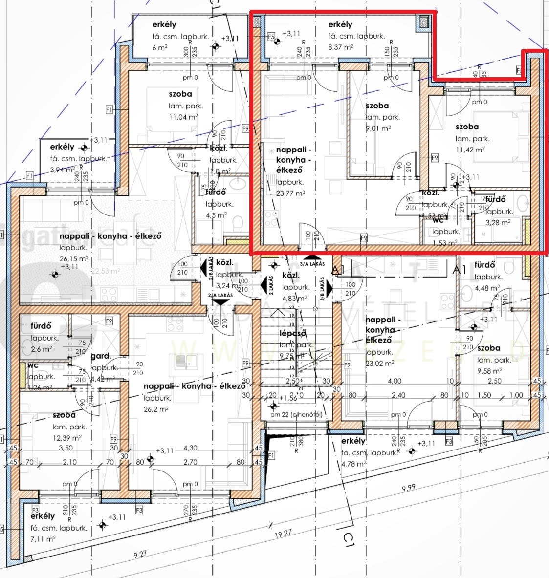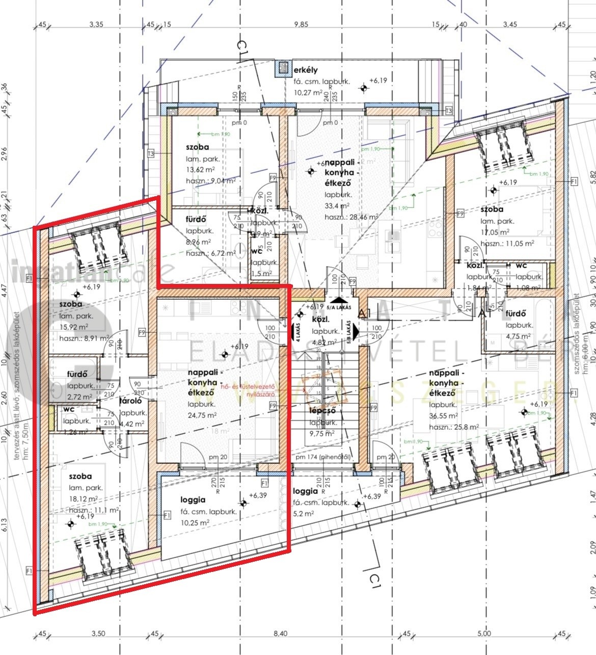 - bruttó 58,38/nettó 46,5 m2-es lakóterületű