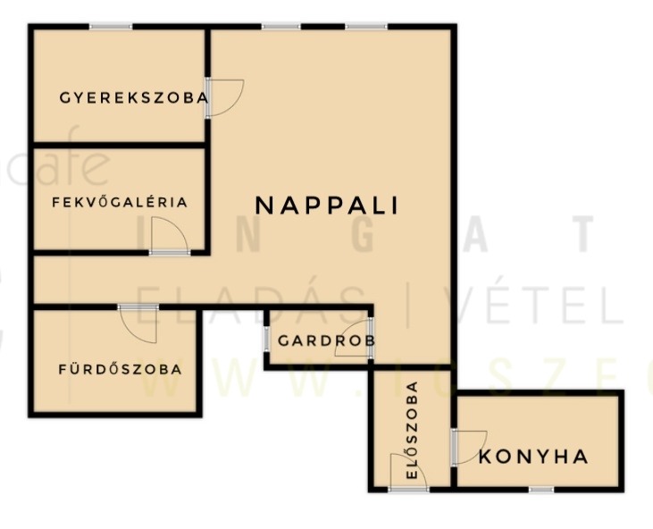 Jelenleg az előszobából egy hatalmas nappaliba érkezünk ami a lakás központi része, innen nyílik a gyerekszoba és egy fekvőgaléria ami alatt szintén egy hálószobát alakítottak ki a tulajdonosai. A nagy méretű fürdőszobában a kád és a wc egy helyiségben van, de akár még tusoló is elfér benne. A konyha most a bejárat mellett található, szeparáltan.